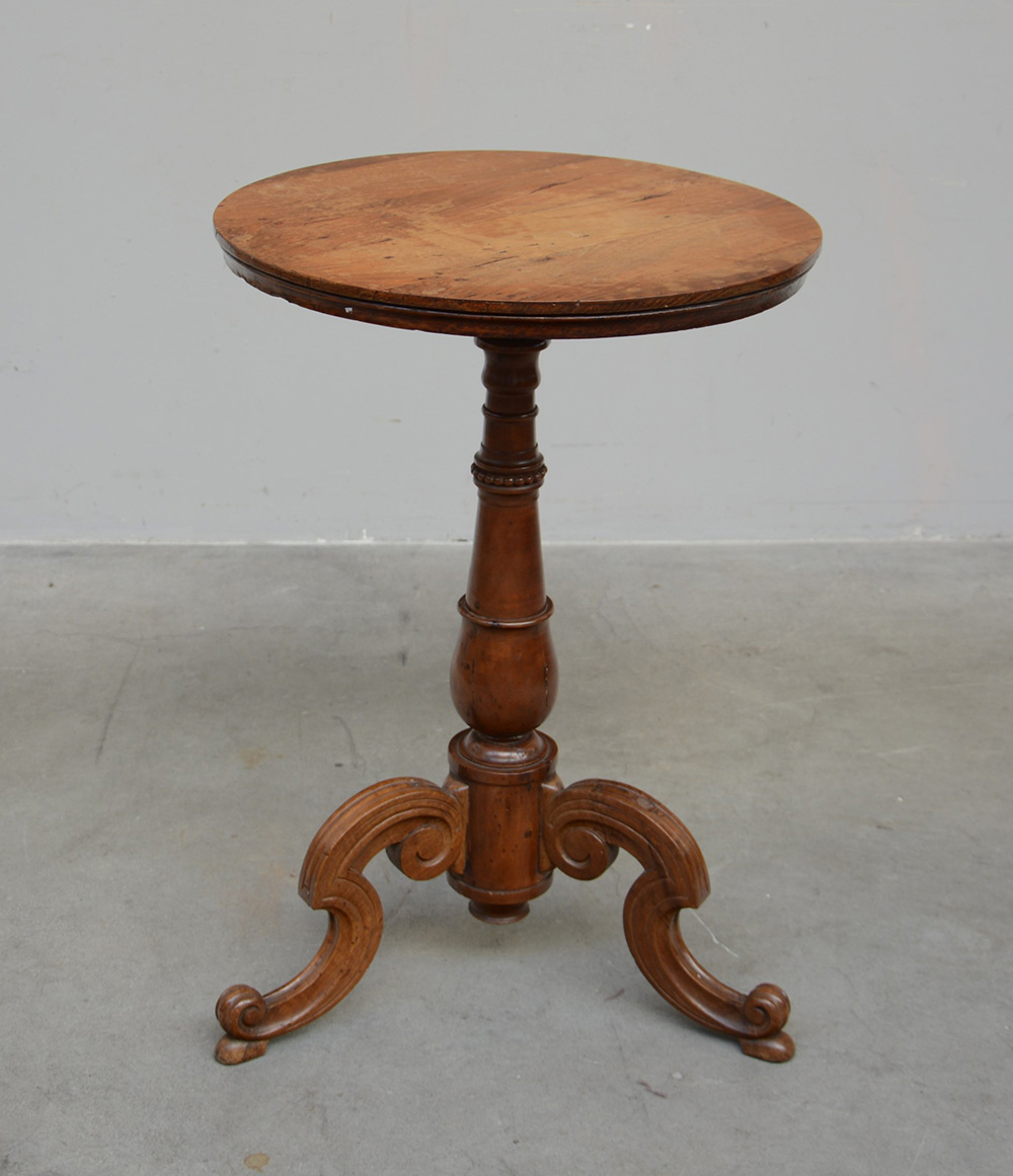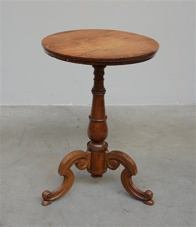 Tavolino tripode in noce (cm 79x78x84) con montanti mossi terminanti a testa di cigno. Piano tondo. (d. cm 37, h. cm 69) (difetti)