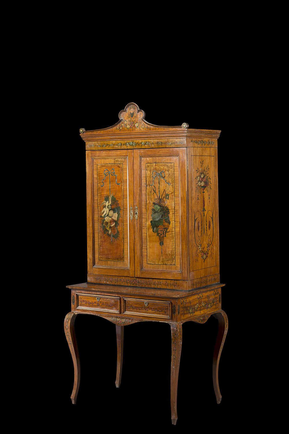 Stipo in satinwood a due battenti con basamento a tavolo, due cassetti sottopiano e gambe mosse, dipinto a trionfi floreali e musicali, fiori sparsi e ghirlande. Inghilterra, sec. XIX (cm 90x201x63) (difetti) -EN A 19th-century English cabinet (cm 90x201x63) (defects)