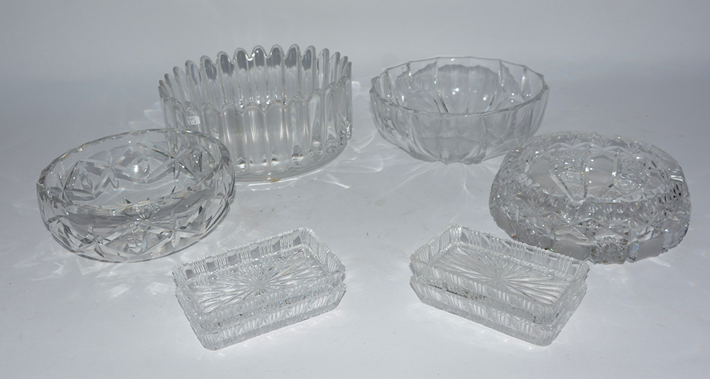 Lotto composto da tre insalatiere, un posacenere e quattro antipastiere rettangolari in cristallo molato (difetti)