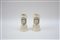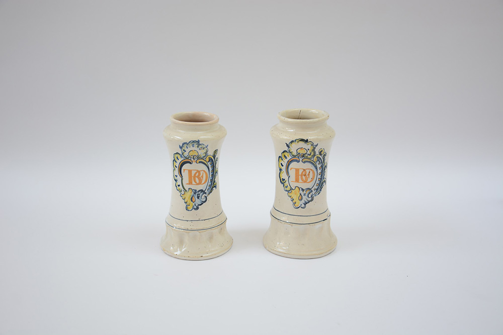 Coppia di alberelli farmaceutici in terraglia bianca di forma cilindrica rastremata e alta base con unghiature nella pasta. Sul davanti è dipinto un cartiglio di gusto rocaille in blu, verde e giallo ed all’interno monogramma in lettere capitali intrecciato in giallo-ocra. Sec. XX (h. cm. 22) (difetti)
