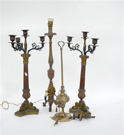 Lotto composto da una coppia di candelieri a quattro fiamme, uno ad una fiamma e una lampada fiorentina in bronzo e metallo (difetti)