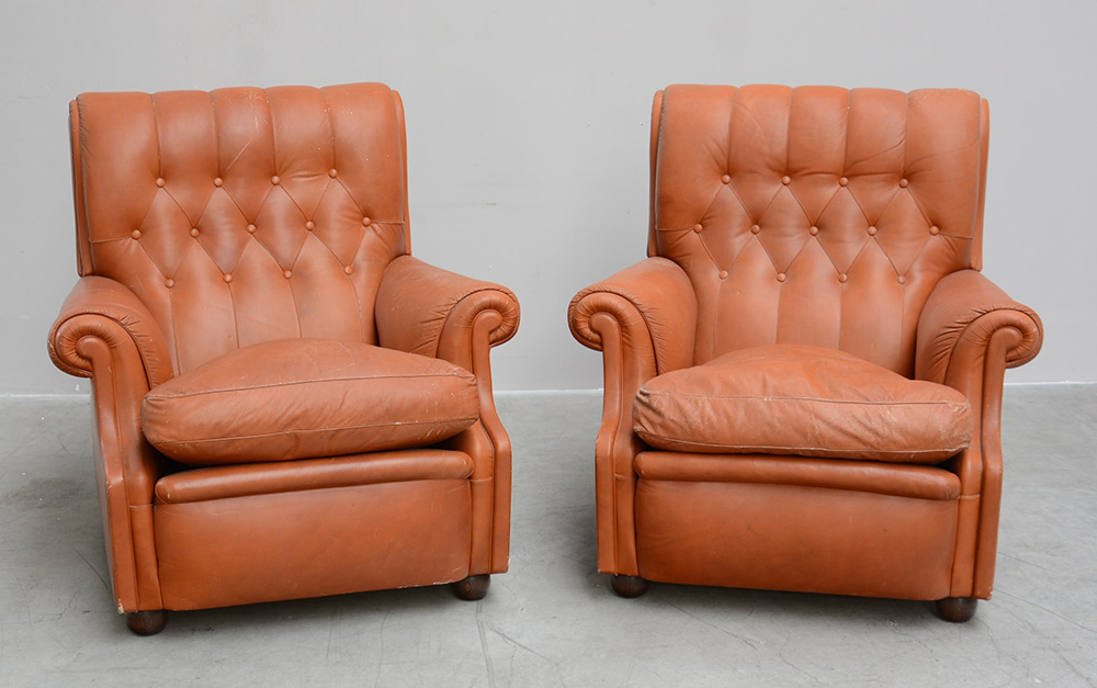 Coppia di poltrone imbottite rivestite in pelle color tabacco chiaro. Italia, anni 80 (difetti)