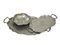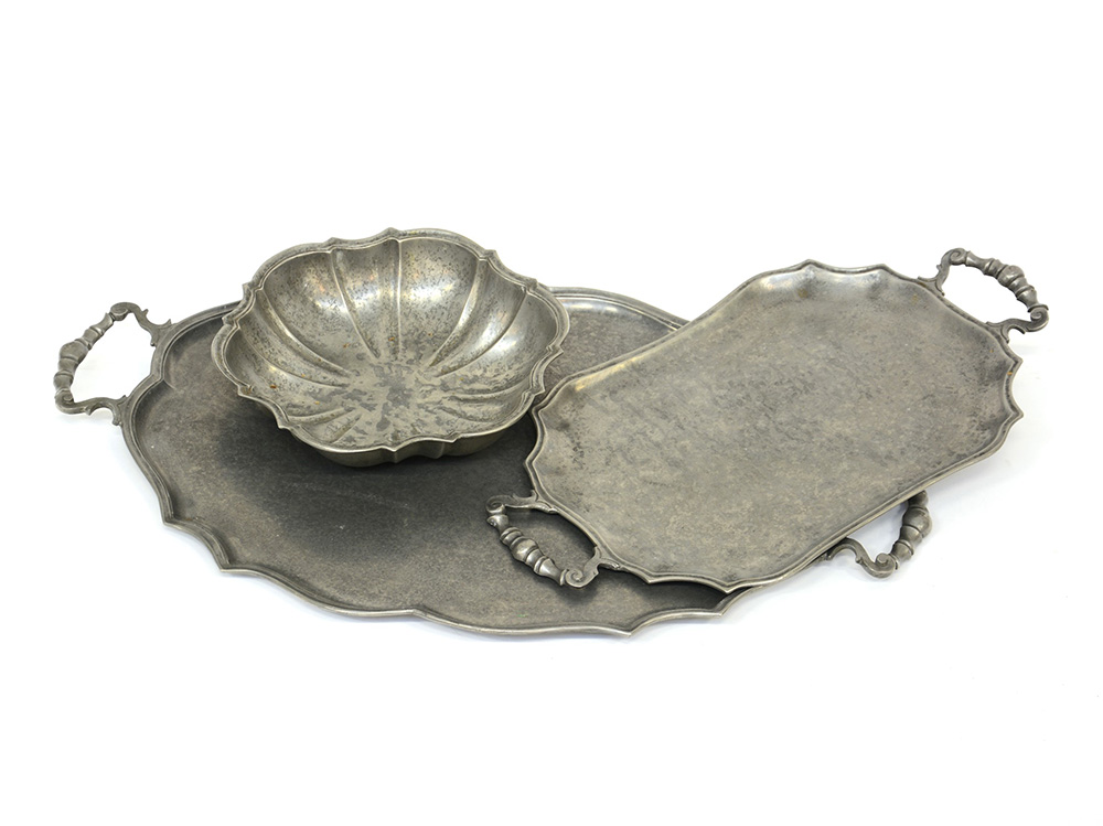 Lotto composto da due vassoi biansati in peltro ed un centrotavola decorato da nervature. Stampigliature di stemmi nobiliari sul fondo. Misure diverse (difetti)
