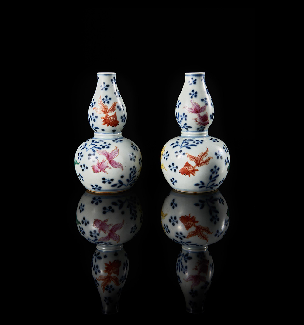 Coppia di vasi in porcellana a forma di doppia zucca decorati a smalti policromi con pesci rossi e motivi floreali, con marchio apocrifo Qianlong alla base Cina, sec. XX (h. 12 cm.) -EN Two small double-gourd porcelain vases with polychrome decorations, with apocryphal Qianlong mark to the base China, 20th century (h. 12 cm.)