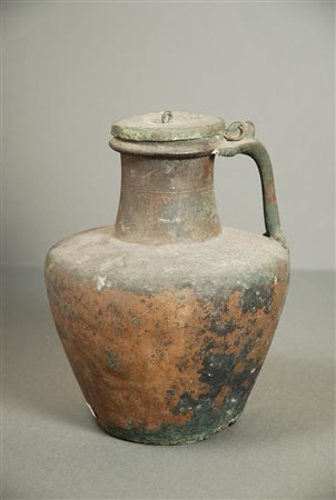 Antico versatoio in rame con coperchio e presa laterale (difetti) (h cm 25).
