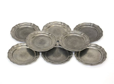 Gruppo di otto piatti in peltro con bordo sabomato (d. cm 19) (difetti)