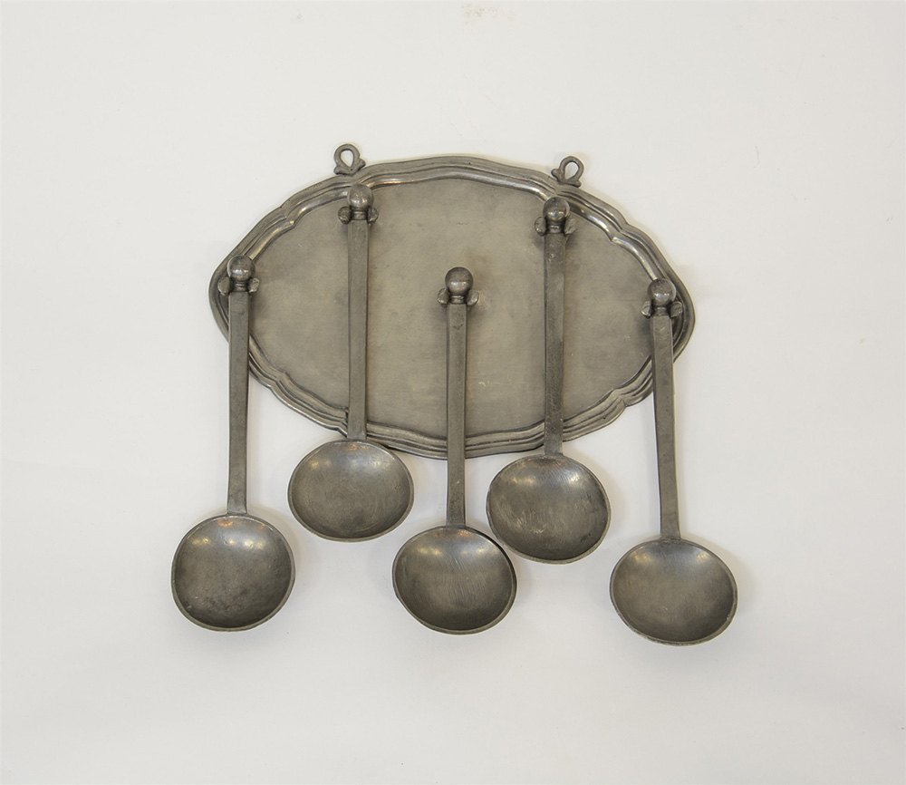 Porta mestoli da parete in peltro completo di sei mestolini (lievi difetti)