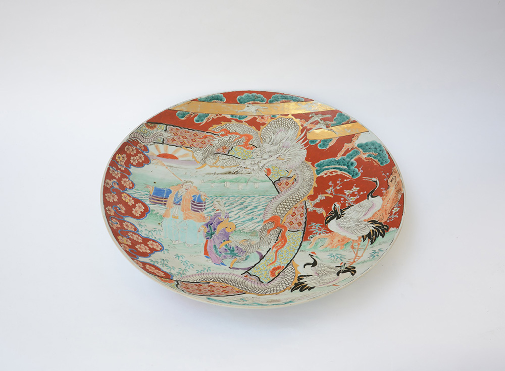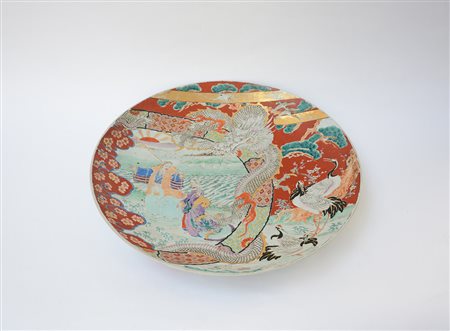 Grande piatto da parata in porcellana Imari decorato con scena di figure in riva al mare Giappone, periodo Meiji (d. 61 cm.)