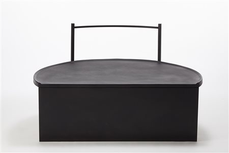 Tavolo basso con struttura in profilato metallico laccato nero e piano rivestito in gomma nera. Italia, anni 80/90 (cm 120x72,5x85) (lievi difetti)