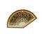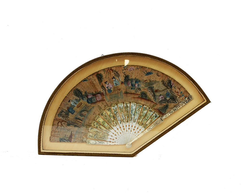 Ventaglio con stecche intagliate e dipinte, pagina in carta dipinta con scene di vita orientale, in teca (difetti)