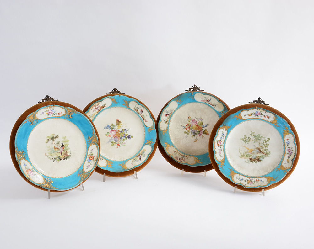 Manifattura di Sevres. Gruppo di quattro piatti di forma polilobata, bordi in turchese con riserve in oro lavorate e decorazione floreale ornitologica. Fine sec. XIX (d. cm 25) (usure, rotture e restauri)