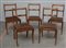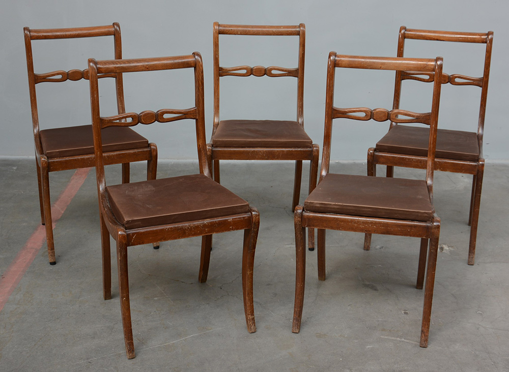 Gruppo di cinque sedie in legno con gambe mosse, schienale a giorno e seduta amovibile (difetti)