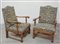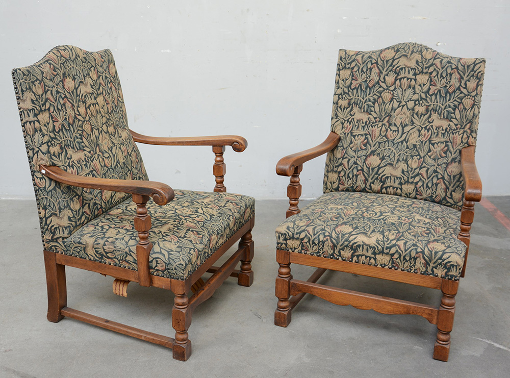 Coppia di poltrone in rovere con tessuto decorato ad animali ed alberi (difetti)