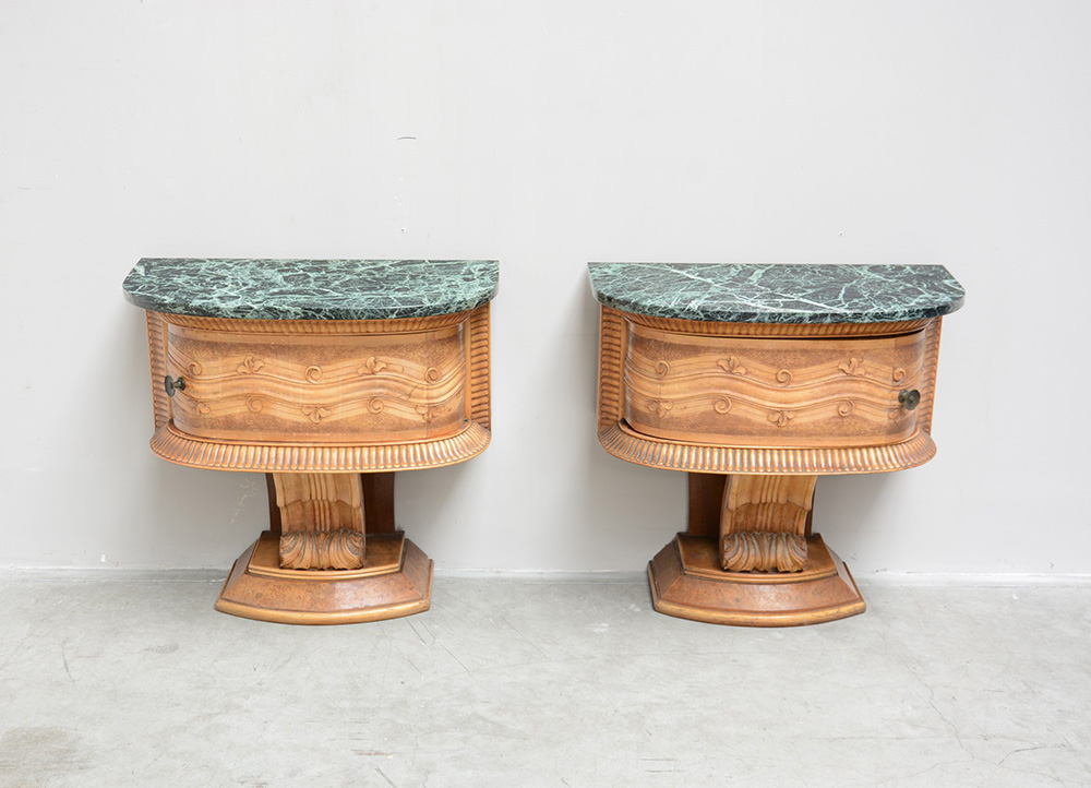 Coppia di comodini con piano in marmo verde impiallacciati, lastronati e intagliati in radica e legno chiaro con motivi di gusto Déco. Piano in marmo verde. Esecuzione Alecta, Lissone, anni 30 (cm 64x64x32) (difetti e mancanze)