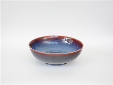 Grande ciotola in porcellana flambè smaltata nei toni del blu e del rosso,...