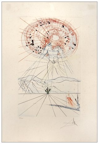 SALVADOR DALI’ Figueres 1904 – 1989 The Bridegroom Leaps 1971 Incisione a colori es.12/250. Firma in b. a d. (56 x 38 foglio – 39,7 x 25 inc. – leggere fioriture) Opera facente parte della cartella “The song of songs of King Solomon” composta di 12 incisioni a colori. Tiratura: VI es. su carta pergamena dal I al VI + XLIV es. su carta Giappone dalla VII alla XLIV + 250 es. num. arabi su carta Arches + 20 es. H.C. in lettere dalla A alla T riservate all’artista. Editore: Leon Amiel, Parigi – New York.
