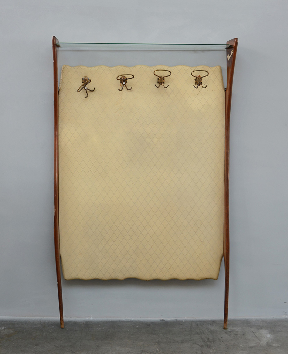 Appendiabiti da parete con montanti sagomati e ripiano superiore in vetro. Italia, anni 50 (cm 110x170x16) (difetti)