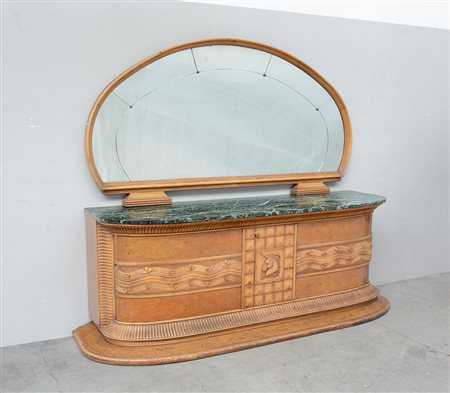Cassettiera con specchiera impiallacciata, lastronata e intagliata in radica e legno chiaro con motivi di gusto Déco. Piano in marmo verde. Esecuzione Alecta, Lissone, anni 30. Timbro a inchiostro della manifattura sullo schienale (cm 200x181x59) (difetti e mancanze)