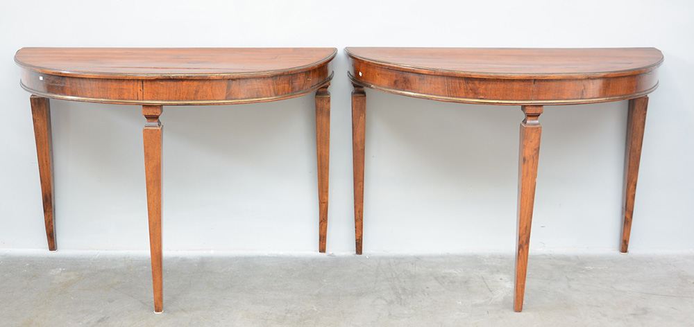 Coppia di antiche consoles a demilune in stile Luigi XVI con tre gambe...