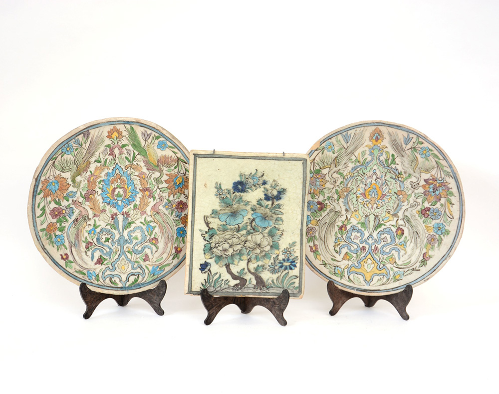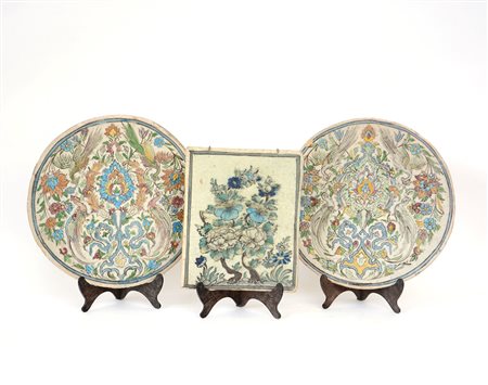 Lotto composto da tre piastrelle di cui due tonde e una rettangolare smaltate in stile Iznik (difetti)
