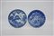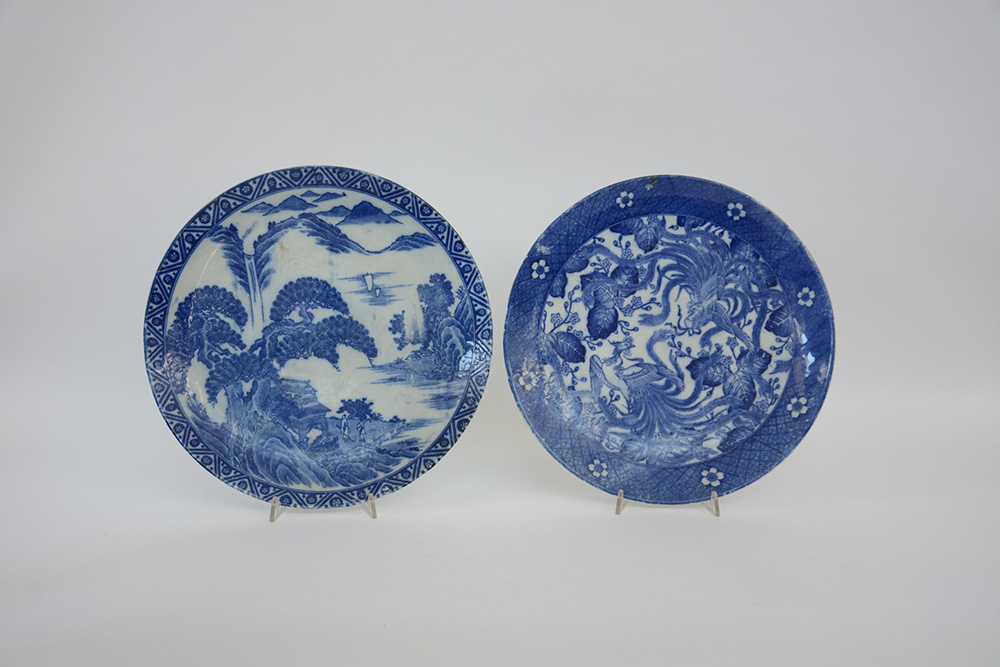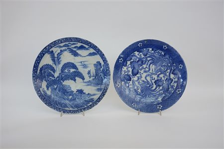 Due grandi piatti in porcellana bianca e blu, con reggi piatti in legno (difetti) Cina, sec XX (d. 38 cm.)