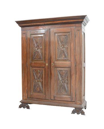 Armadio in noce a due ante pannellate e scolpite a motivi vegetali, montanti scanalati, piedi a mensola intagliati , sec. XVIII (182x228x61) (difetti e restauri)