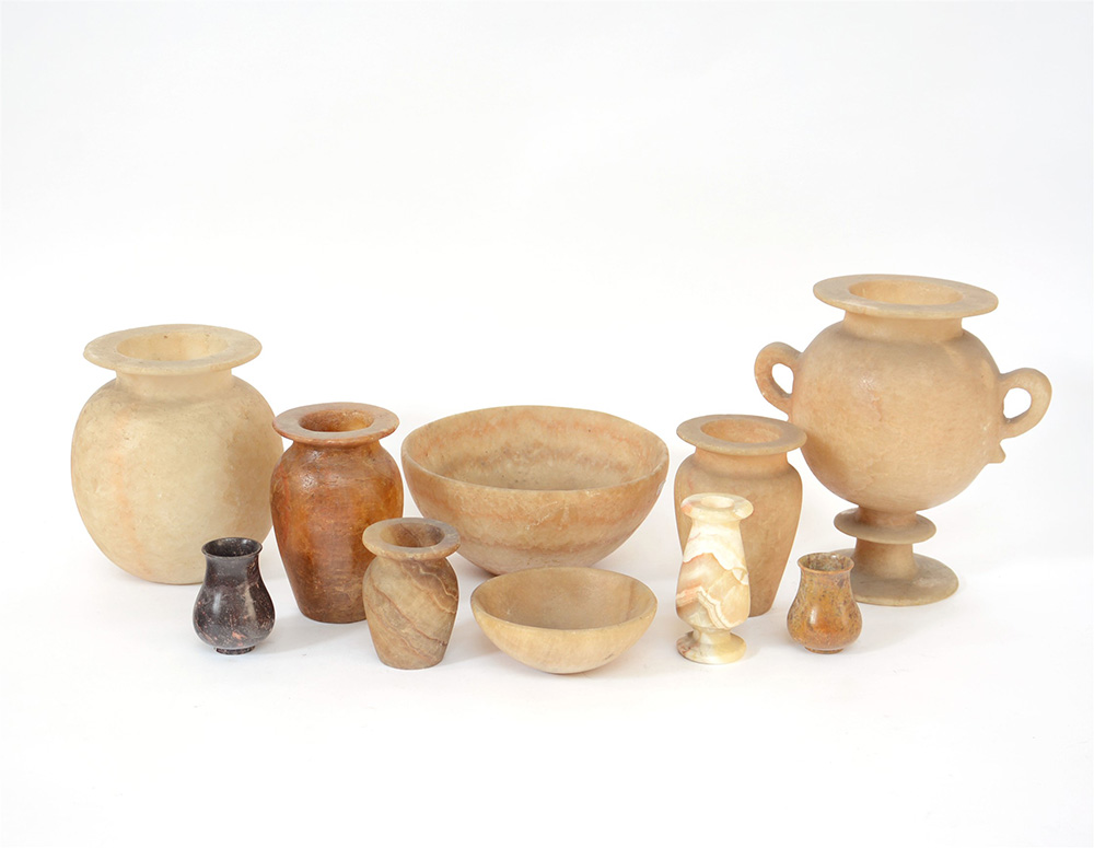 Lotto composto da una coppa biansata, due ciotole e sette vasi dall'antico in alabastro e marmo (misure diverse) (difetti)