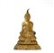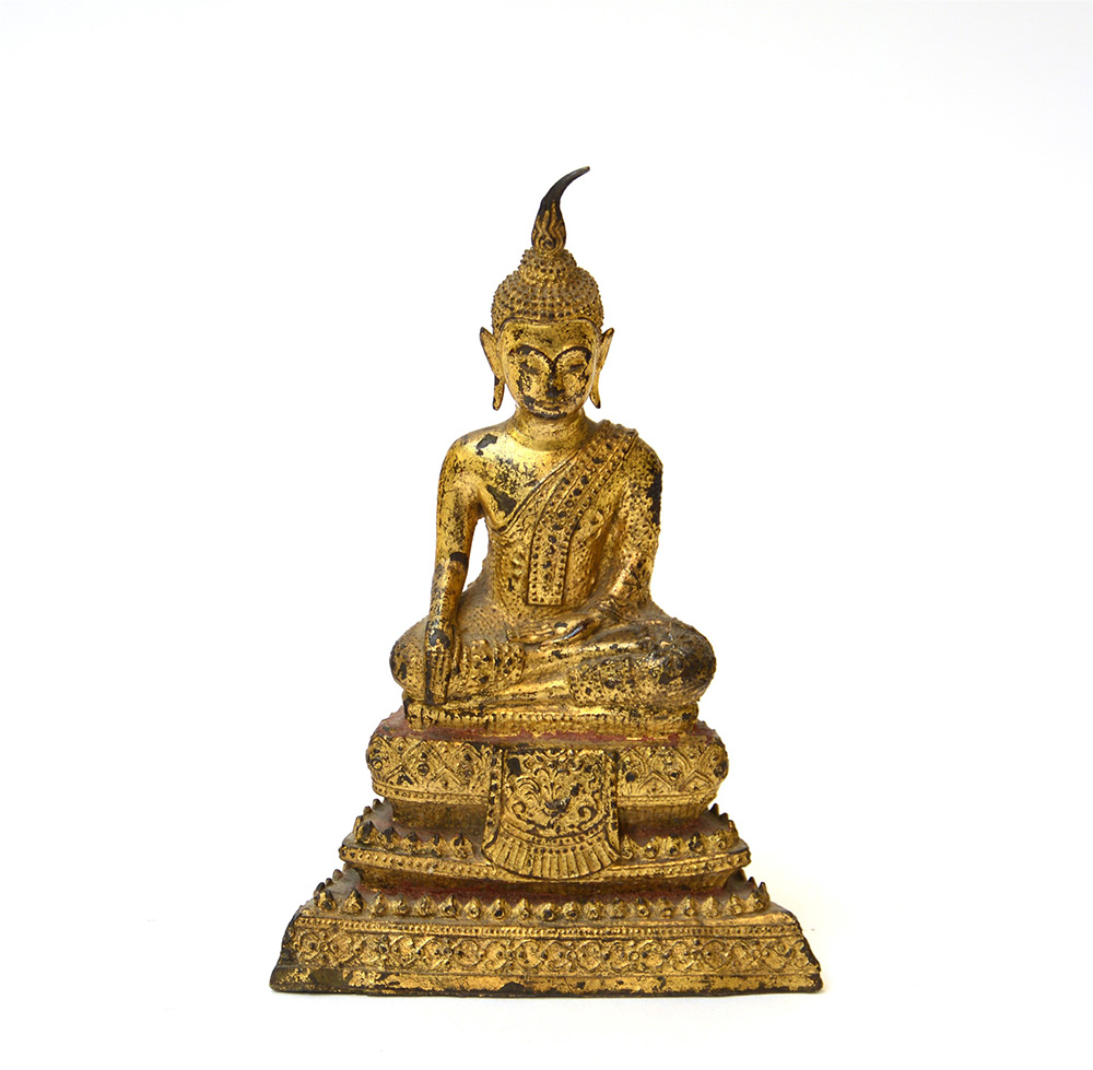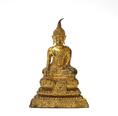 Buddha in bronzo dorato raffigurato seduto su alto trono (lievi mancanze)...