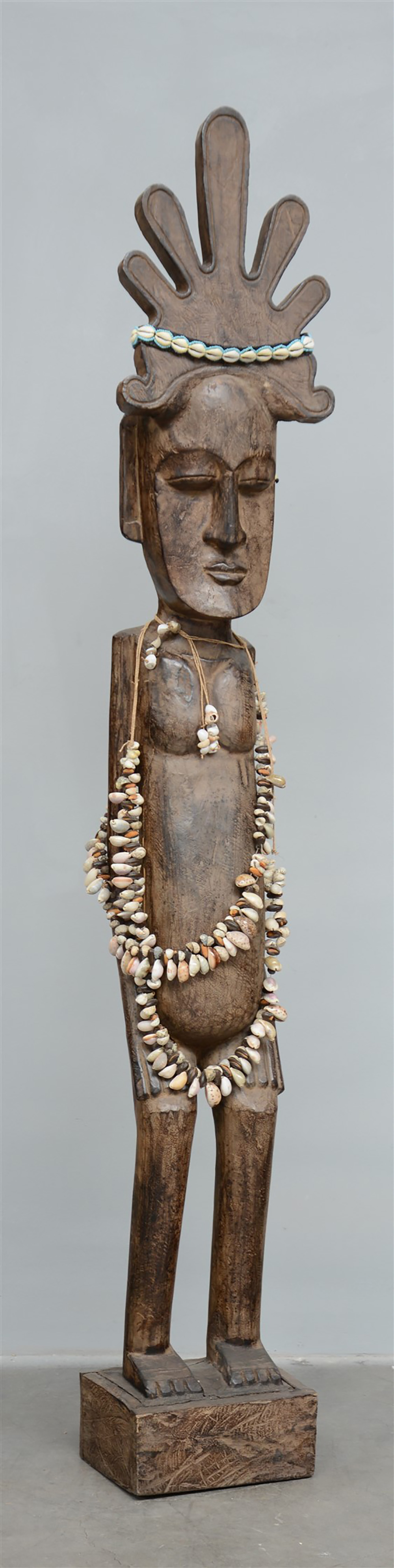 Scultura lignea africana decorata con pendenti e conchiglie (h cm 180) (difetti)
