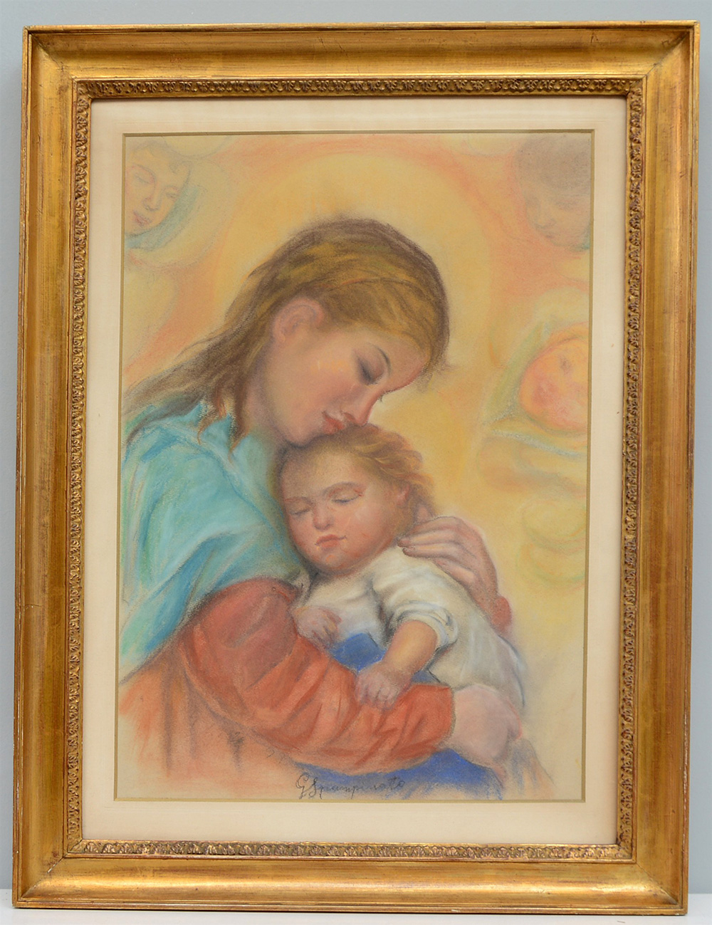 Giuseppe Spampinato (Catania 1901) "Madonna con bambino" pastelli colorati su carta (cm 64x45 firmato in basso al centro, in cornice