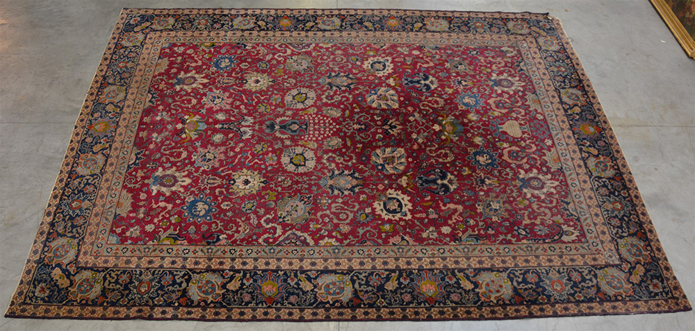 [Tappeti] Tappeto Tabriz, Persia secolo XX. Disegno all.over floreale policromo su fondo rosso rubino, bordura Herati (cm 408x326) (difetti)