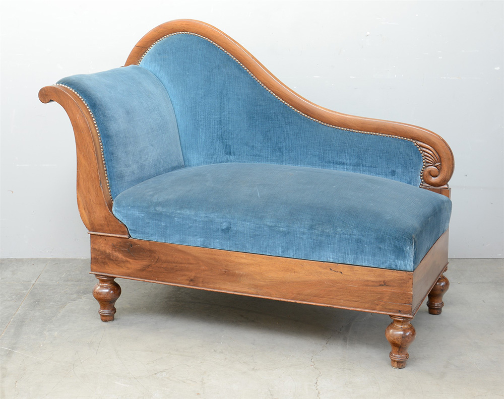 Dormeause in noce con schienale sagomato e intagliato a ricciolo. Gambe tornite. Sec. XIX
