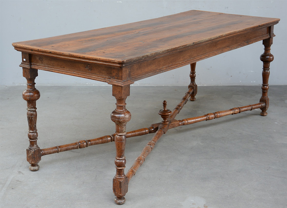 Antico tavolo da pranzo rettangolare con gambe e traverse tornite decorate al...