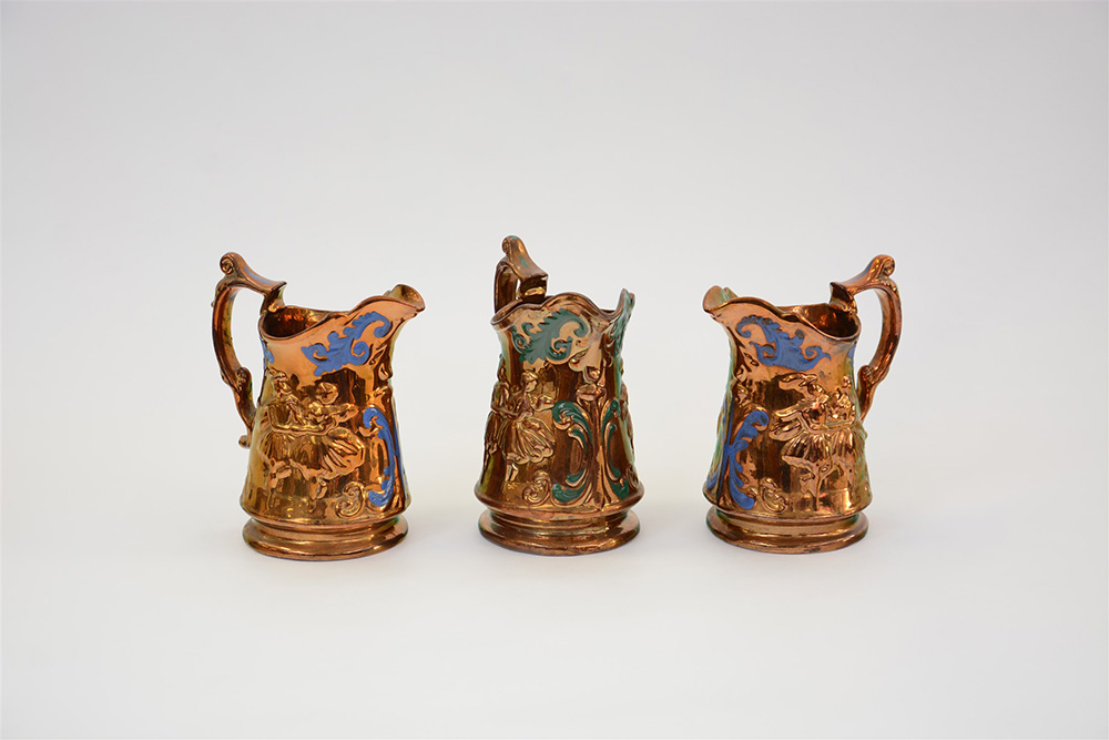 Manifattura del sec. XX, gruppo di tre brocche in ceramica dorata decorata in rilievo con figure settecentesche (difetti)