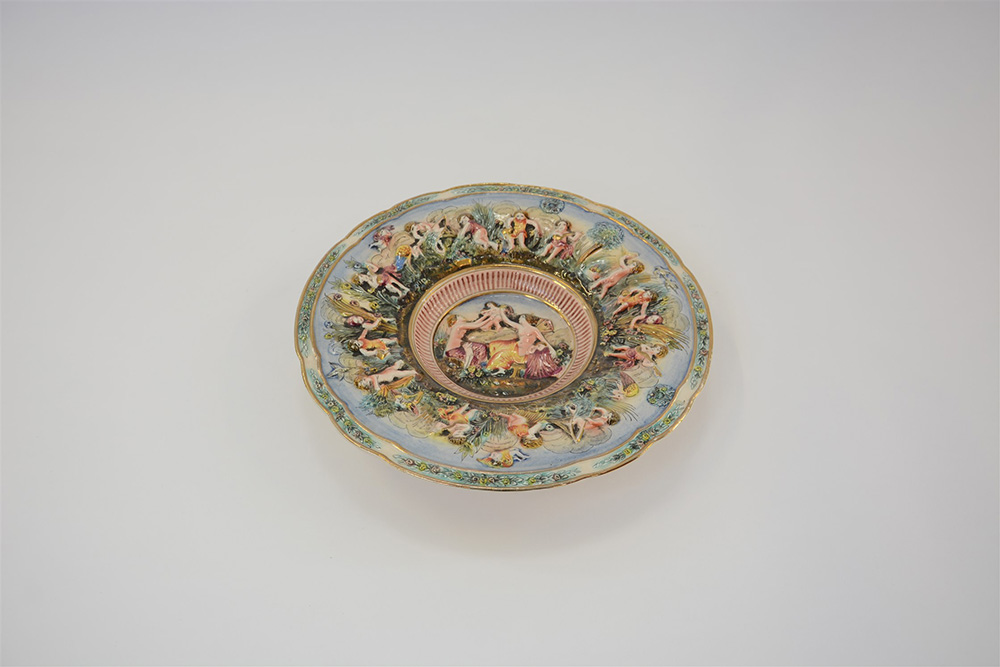 Manifattura C.A.S. Piatto in ceramica policroma decorato in rilievo con putti...