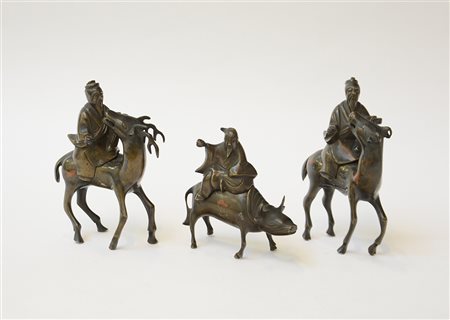 Tre sculture in bronzo raffiguranti saggi a dorso di vari animali ina sec. XX (h. max 17 cm.)