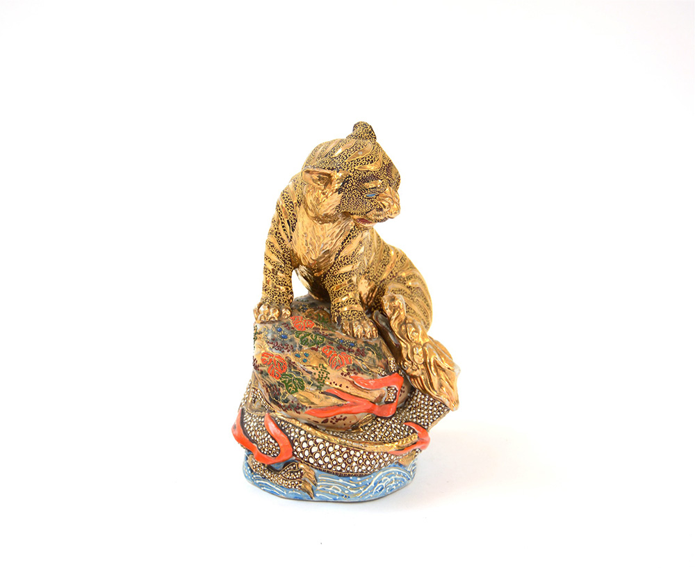 Scultura in porcellana Satzuma raffigurante tigre e drago su una roccia...
