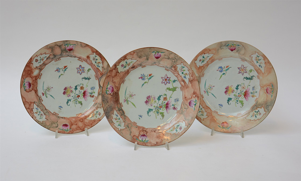 Compagnia delle Indie. Tre piatti Famiglia Rosa con decorazione floreale e bordo "faux-bois" ( gravi restauri) Cina, sec. XVIII (d. 23 cm.)