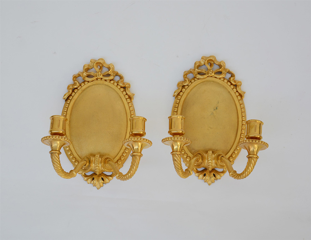 Coppia di appliques a due fiamme in bronzo dorato con porta candele sagomati poggianti su supporto ovale con cimasa a fiocco (h. cm 25)