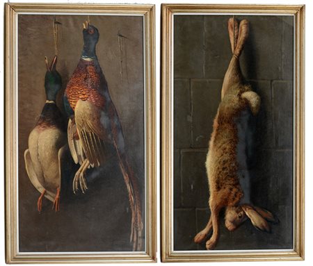 "Lepre" e "Anatre" coppia di dipinti ad olio su tela (cm 97x49) firmati in basso a destra, in cornici