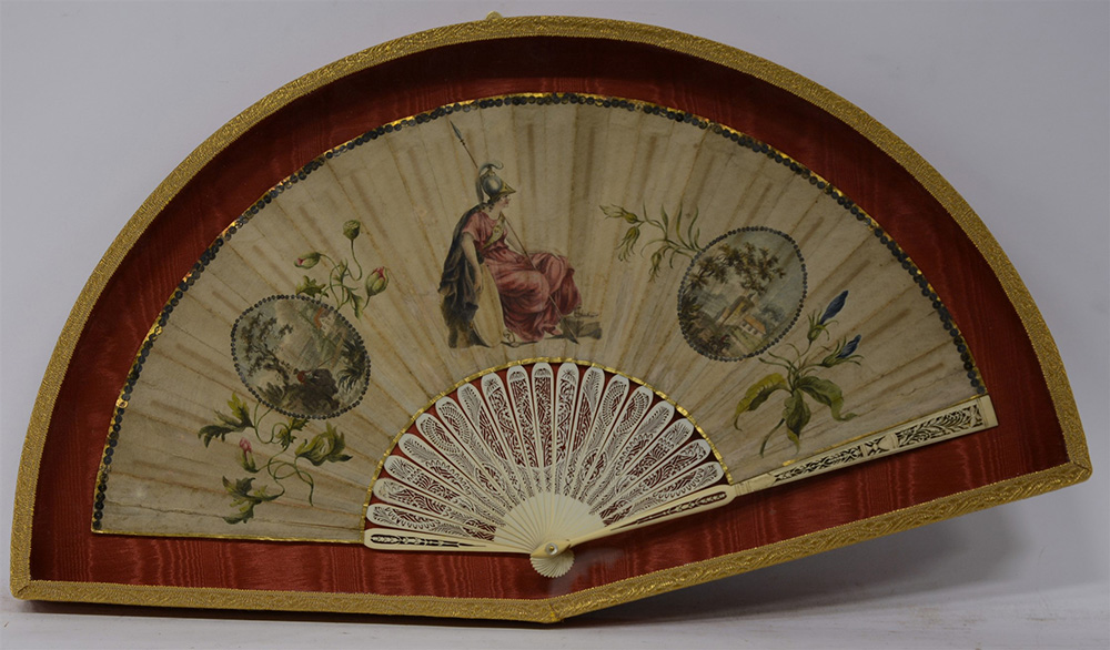 Ventaglio con pagine in carta decorate con scena classica, stecche in avorio traforato. Entro teca (difetti)