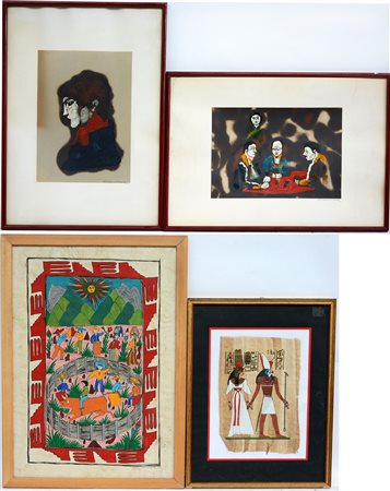 Lotto composto da due tecniche miste, un papiro egizio e un dipinto etnico. Autori e misure diverse, in cornici (difetti)