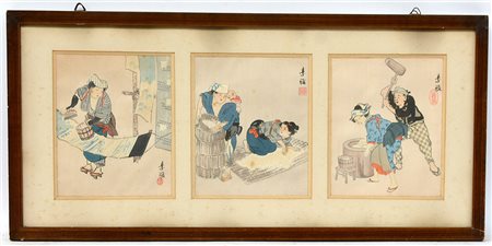 Gruppo di tre stampe giapponesi acquerellate raffiguranti scene di vita quotidiana, firmate, in unica cornice (difetti) (ognuna 17x20,5 cm.)