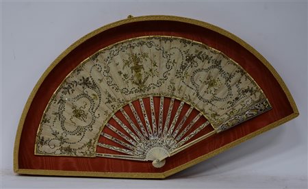 Ventaglio con pagine in stoffa e stecche in avorio, entro teca (difetti)