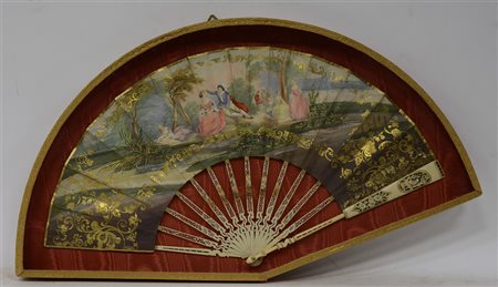 Ventaglio con pagine in carta e stecche in avorio inciso e traforato, entro teca (difetti)