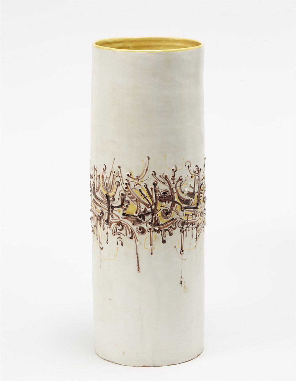 Vaso in ceramica di forma cilindrica, smaltato in policromia e decorato a graffito e a rilievo con motivi astratti. Italia, anni 50 (h cm 46) (lievi difetti)
