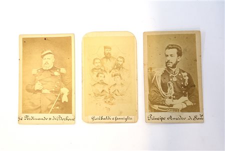 Lotto composto da tre fotografie, di cui una con soggetto il Principe Amedeo di Savoia, una Garibadi con famiglia ed una Ferdinando II Re di Napoli, sec. XIX (cm 10x7) (difetti)