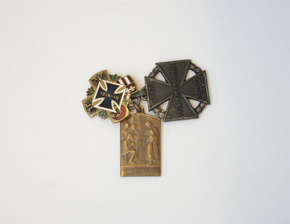 Lotto composto Croce di partecipazione della Prima Guerra Mondiale, Austria, datato 1916; una medaglia commemorativa austriaca e curiosa spilla in metallo e smalti con croce di ferro, '14-'18 e gli stemmi di Austria, Ungheria, Prussia e Impero Ottomano. (difetti)