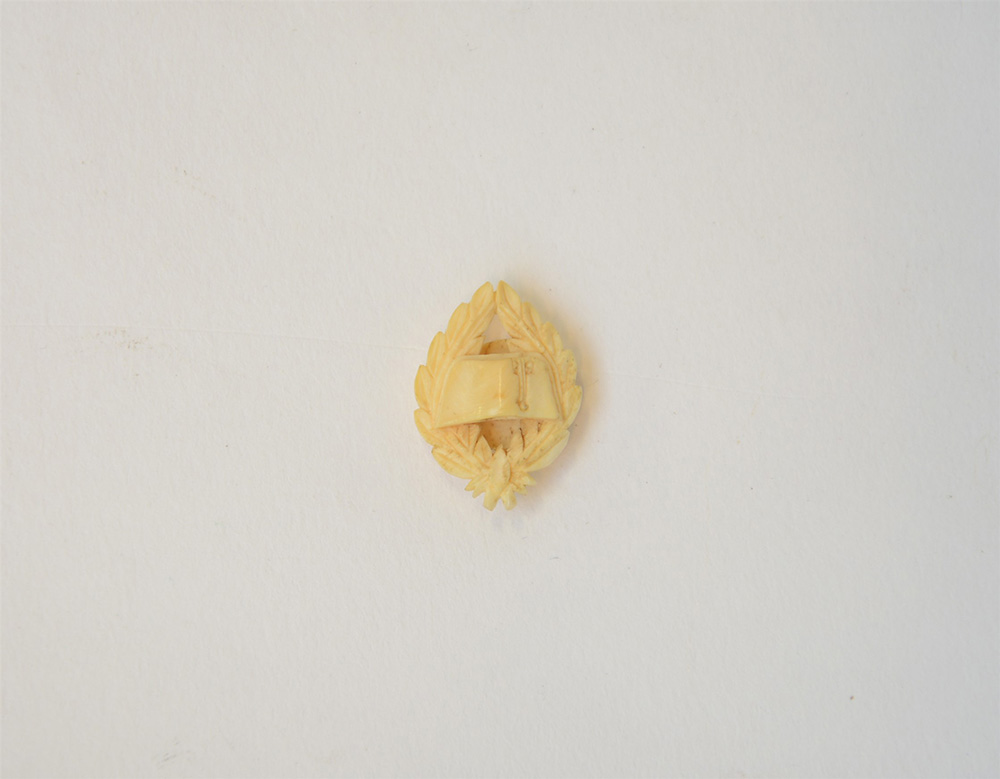 Curiosa cimice da occhiello in avorio intagliato raffigurante il cappello di Napoleone all'interno di un serto di alloro, metà sec. XIX