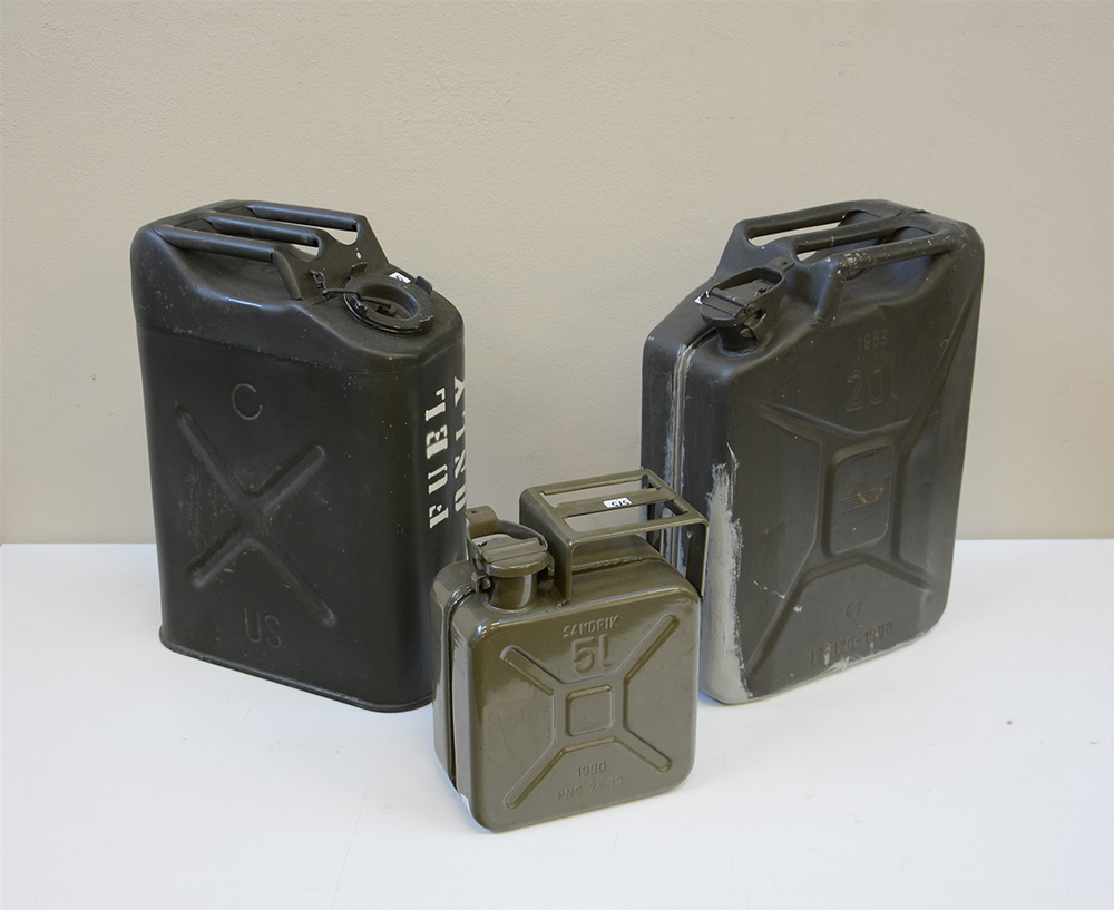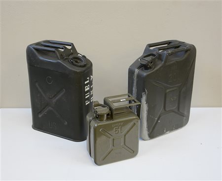 Lotto composto da due taniche metalliche militari unite ad una più piccola, sec. XX (h max 55 cm) (difetti)